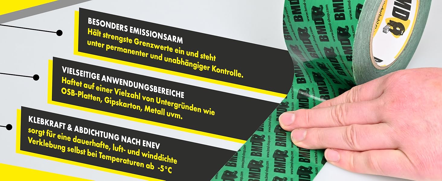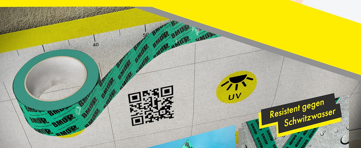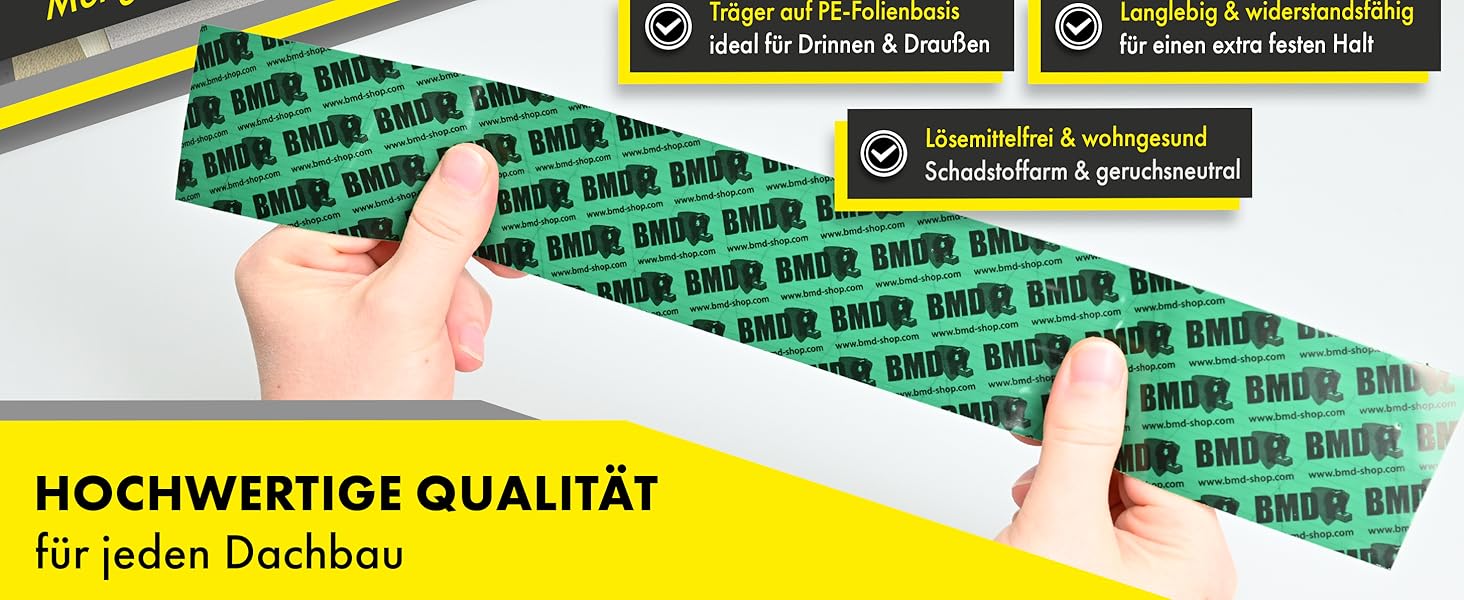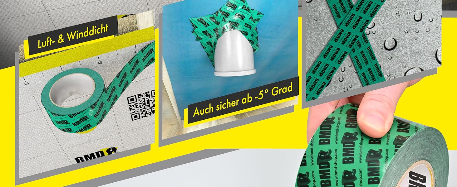Das BMD San ist für die luftdichte Verklebung von Anschlüssen und Durchdringungen wie zum Beispiel Fenster, Sparren, Pfetten, Abluftrohre oder Kabel, sowie für Verklebungen von Überlappungen für alle gängigen CE-geprüften Dampfbrems- und Dampfsperrfolien im Dach- und Innenausbau bestens geeignet.